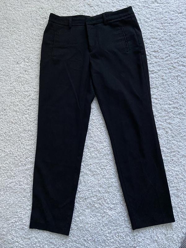 Брюки Zara в размере 40 из имитаций карманов, средней посадки. Брюки имеют рельефный принт в горошек.