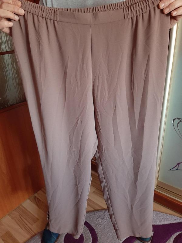 нові штани ,поліестр,,колір темно кофейний,талія 50/60,поб 72,не тянеться тканина,посадка перед 36 зад 42,довжина 106,шаг 75,,ширина штанини півобхват 20,внизу на штанині не величкі по боках розпорки і 3 гудзика