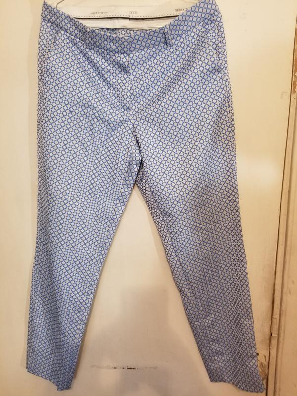 Полуобхват талии 40,длина по боковому шву 97,по внутреннему 71,штанина низ 16,полкобхват бедер 57,посадка перед 24,полиэмтер-эластан,легкие.