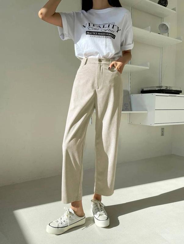 Базовые, укороченные брюки, с высокой посадкой❤️ Они идеально впишутся в твой повседневный гардероб😍 Брюки Размер: 42-44, 46-48 Цвет: светлый беж Ткань: микровельвет