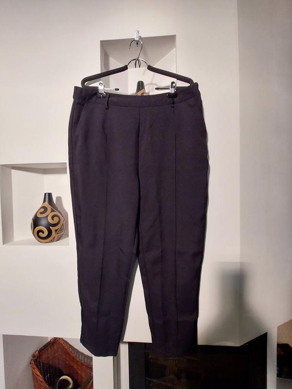 состояние идеальное черного цвета нет следов носки 93% полиэстер 7% эластан застегивается сбоку на потайную молнию есть шлевки для ремня есть два боковых кармана к низу слегка зауженные высокая посадка средней плотности замеры пот 46 поб 58 посадка 36/48 длина 100 шаговый 66 низ по 18