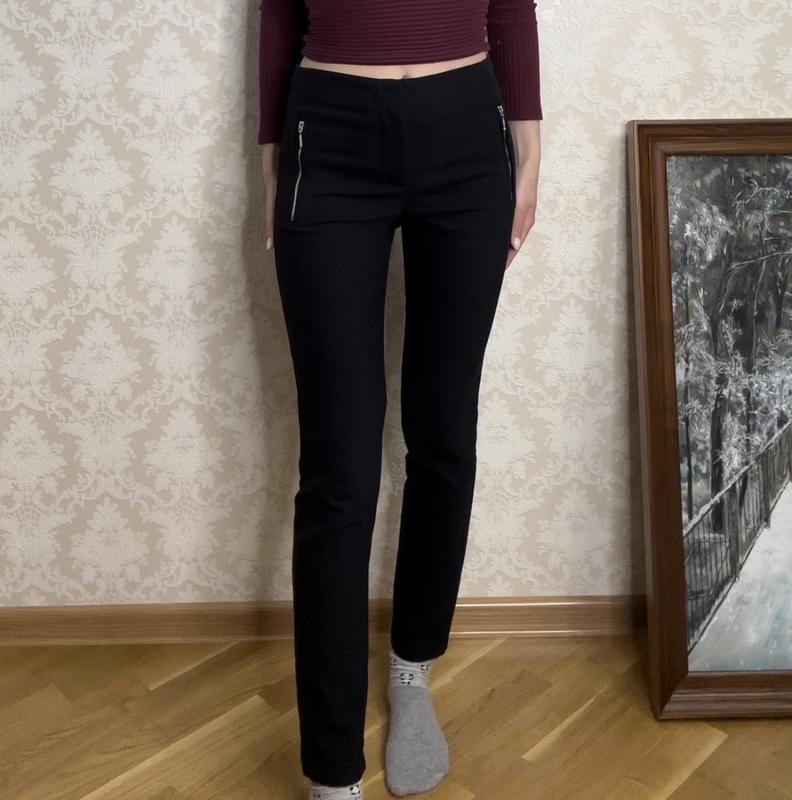Черные брюки, брючного типа скинни, очень красиво смотрятся на фигуре Стан - идеальный Размер хс, будет на с 57% коттон Замеры ПОБ 41 Длина изделия 96 По внутр шву 73