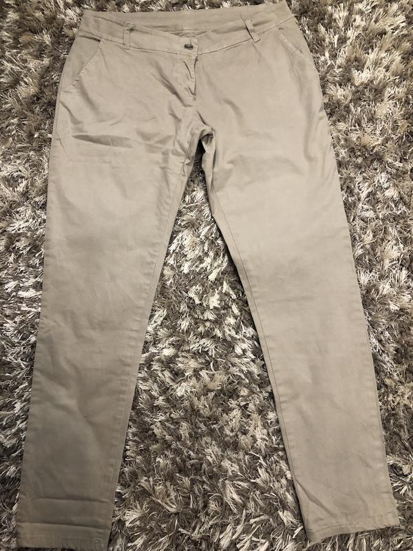 Штани розмір XL по бирці (маломмірять) йдуть на 46-48, склад 95% cotton,5% еластан, колір дуже світлий хакі. Заміри на фото.