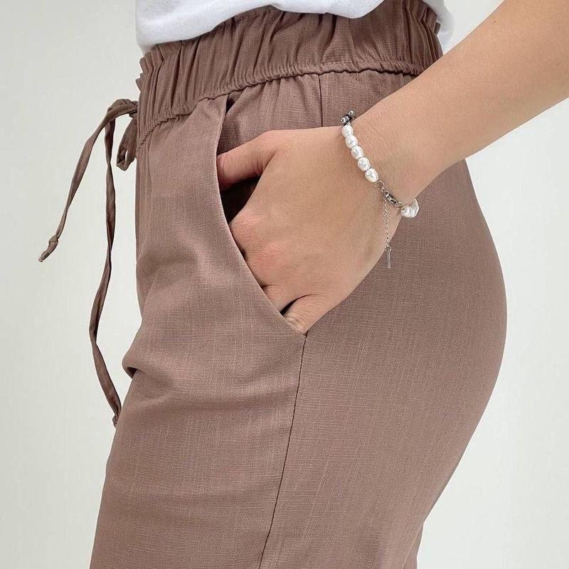 Укороченные женские штаны с карманами Льняные брюки - это легкий и стильный вариант для деловых, повседневных и спортивных летних образов. Для обновления вашего гардероба представляет модную новинку - укороченные брюки. Модель отличается имеет актуальный фасон и интересную фактуру. Характеристики модели Укороченные штаны имеют ряд особенностей: - - свободный крой, штанины слегка заужены книзу; - - высокая посадка; - - пояс на резинке, стягивается шнурком; - - укороченные штанины (длина 7/8) с отворотами; - - функциональные боковые карманы. Штаны пошиты из натурального стрейчевого льна, который отлично пропускает воздух и комфортно ощущается даже в самые жаркие дни лета. Свободный фасон брюк будет удобен для модниц с любым типом фигуры. Укороченные брюки, зауженные книзу, можно носить с рубашкой, футболкой, блузкой и др. Благодаря универсальному фасону они подойдут практически к любому типу обуви - от кедов до босоножек на платформе или танкетке. Характеристики - Стиль:Casual - Сезон:Лето - Длина шагового шва (без подворотов):70-72 см - Длина бокового шва (без подворотов):102-105 см - Материал:Стрейч-лен ТАБЛИЦА РАЗМЕРОВ РАЗМЕР ОБХВАТ ГРУДИ ОБХВАТ ТАЛИИ ОБХВАТ БЕДЕР 40 74-80 60-65 84-87 42 82-85 66-69 88-91 44 86-89 70-73 92-94 46 90-93 74-77 95-98 48 94-97 78-81 99-103 50 98-102 82-85 104-107 52 103-107 86-90 108-111 54 108-111 91-94 112-116 56 112-115 95-98 117-119