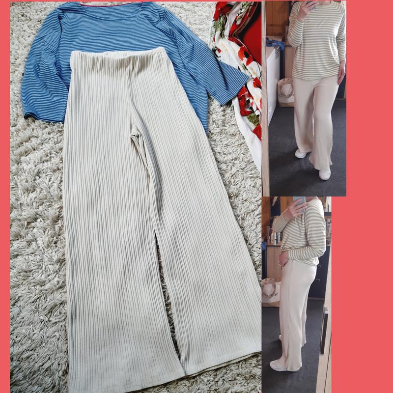 Стильные широкие штаны палаццо в рубчик в молочно/кремовом цвете, состояние идеальное, размер указан 42, на фото на 40 и рост 170. Замеры ПОТ 38-80 ПОБ 52-80 Посадка 33/41 Длина 106/75 1/2ширина штанины верх 34+ низ 34+