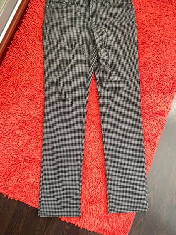 Брюки в отличном состоянии. Легкие, удобные и комфортные. Мелкая клетка. Замеры: Длина: 106см, из них 3см пояс. Длина штанины по внутреннему шву - 82см П/о по талии - 43см (под ремень) Посадка - спереду 22см, ззаду -37-38см. Ширина штанины внизу п/о - 18см Ткань полиэстер - тянется. Без дефектов.