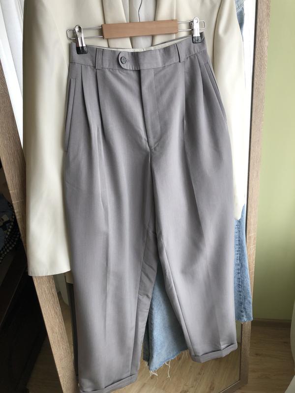 Сірі брючки на високій посадці зі стрілками ,можна завертати на поясі на штанках підкати ,збоків кишеньки йдуть фасону «бананів»широкі Розмір М пояс 33 см поб 50 см довж 104