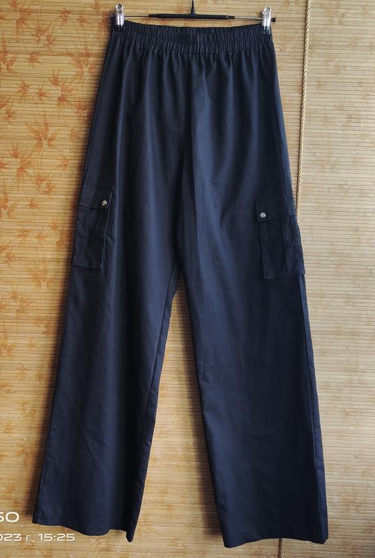 Стильные летние трендовые брюки карго свободного кроя. Пояс на резинке.Стан брюк новый но бумажной этикетки нет. ПО пояс-34см ПОБ-52СМ ПОСАДКА-33см Длина брюк по внешнему шву-111см Длина брюк по внутреннему шву-81см Ширина низа калоши-28см