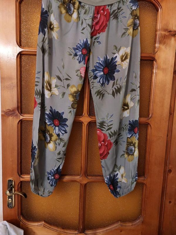Довжина 108- 78 см, нот 34- 46 см ,нос 63 см, посадка 30- 39 см , ширина штанини 34 см верх, 31 см низ. внизу гумка. шаровари