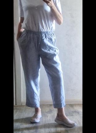 Льняні штани, в розмірі L сірувато-блакитного кольору. На гумці. Пот 32, тягнеться до 44 По стегон 57 Посадка 35 Довжина 88 Відправлю безпечною доставкою за умови повної оплати на ШАФУ, Укрпоштою лише після повної проплати на карту