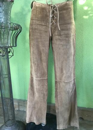 Стильные брюки клешь от колена из натуральной замши светло-коричневого цвета. На подкладе до колена. Замша ооочень мягкая. Размер по бирке-38. Замеры: длина по наружному боковому шву-102 см, по внутреннему-79 см, ПОТ-41 см, ПОБ-46 см, полуширина штанины внизу-25 см. Очень стильные!
