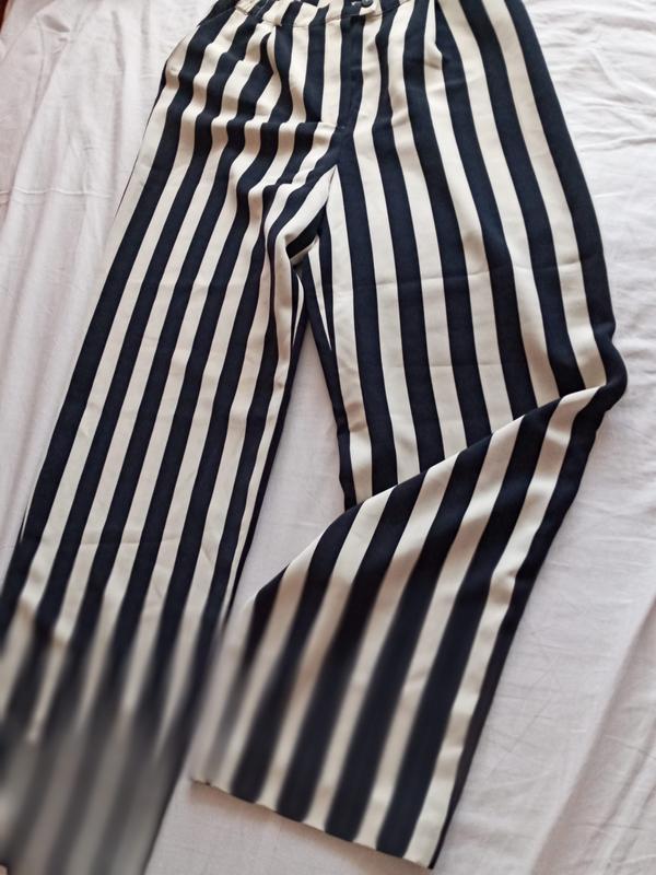 отличные брюки женские, яркие: в широкую белую и темную синюю полоску, классического покроя, размер М, состав 100%, Замеры: ПОТ 39см, ПОБ 54см, длина 105 см, ширина штанины внизу 22см. полиэстер очень приятен к коже.