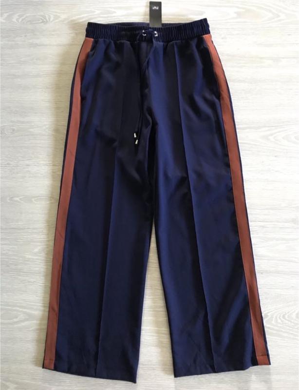 Новые классные брюки F&F с лампасами, с карманами. Размер 12/40. Довжина 105 см, внутр 77 см. ПОТ 39-50 см. ПОС 60 см. Посадка 40/36. Полиэстер/эластан.