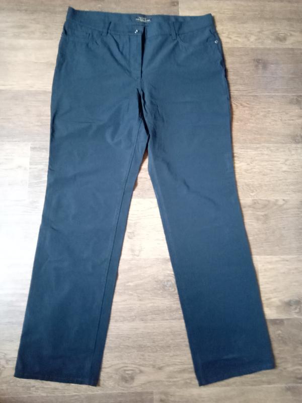 Лежат идеально по фигуре, приятная на ощупь ткань. Цвет глубокий чёрный (камера не передаёт). Пояс 48-49 ПОБ 56-58, + хорошо тянутся до 60 Длина 110 Посадка спереди 28,5, сзади 42,5 Ширина штанины по низу 21 52 % хлопок 43 % полиамид 5 % эластан