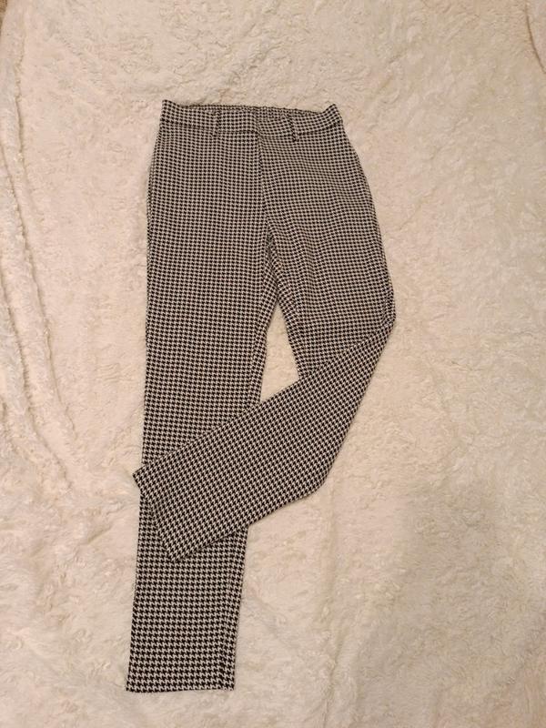 Брюки, укороченные и заведенные. Пояс на резинке. Застежек нет