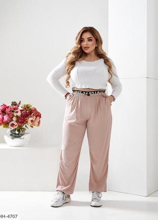 Штани HH-4709 Размеры: 50-52, 54-56, 58-60 Ткань: штапель-твил Замер: Длина изделия: 107 см Длина по внутреннему: 79 см Цвет: пудра, молочный, голубой, фисташка 50-52 размер О / Б - 126 см 54-56 размер О / Б - 132 см 58-60 размер О / Б - 140 см.ск3.Не нажимайте на кнопку Купит,технические проблемы подписывайтесь..жду)