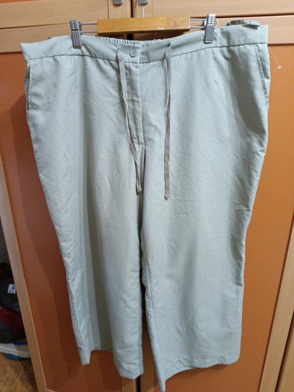 укороченные, могут быть капри, колir оливка, размир 50-52-54, смотри замиры: талия сзада на резинке 51-56, длина 90, бедра 64, ширина штанины в ляске 38, посадка перед 28, посадка зад 43, пошаговой62, ткань тоненькая