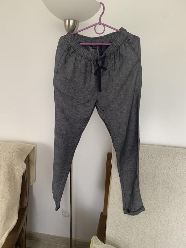 Длина-98, полуобхват талии-35(45), бедер-54, брючины внизу-15, состав:55- лен,45- вискоза.