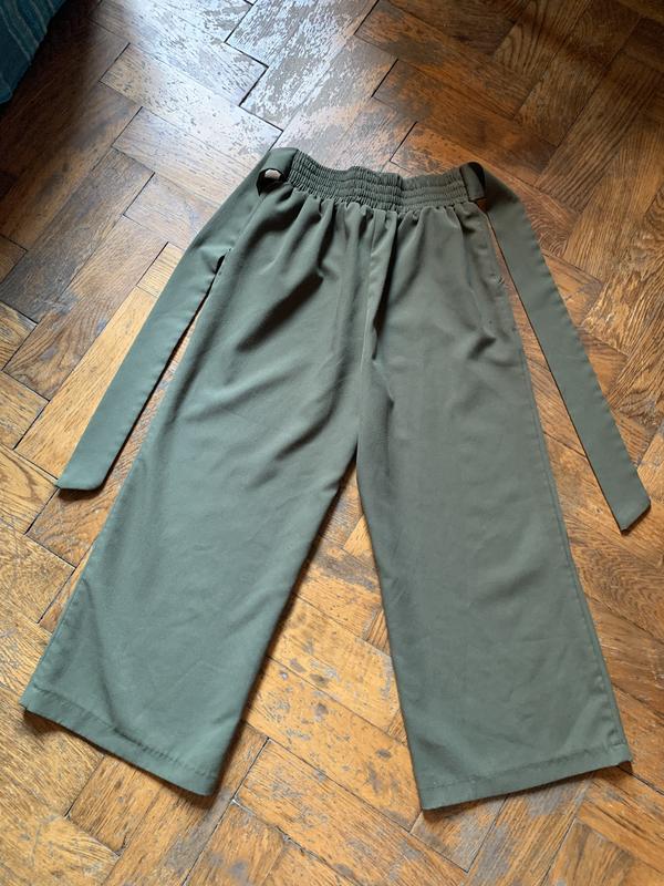 Брюки широкие укороченные, с поясом на резинке и завязывающемся поясом, карманы , ткань мягкая , но плотная , хорошо сидят по фигуре, держат форму