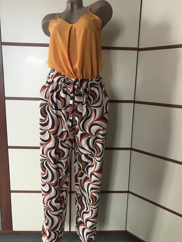 Красиві,легенькі штани,розмір 2XL-3XL(вказаний 18)довжина 108см,пот 45-58см(в поясі резинка,стягується пояском)поб 59см,збоку кишені,ширина штанини внизу 30см.