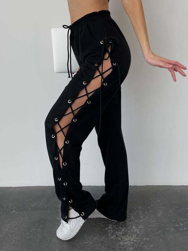 Фото ВЖИВУ ✅ Трендовые брюки со шнуровкой 😍 ▪️Модель - sh 261 ▪️Размер - 42-46 ▪️Тканина - двохнитка ▪️Цвет -черный Это будут твои любимцы в шкафу 🔝 Идеально стильные брюки, свободного кроя, с акцентом на защёлках💔