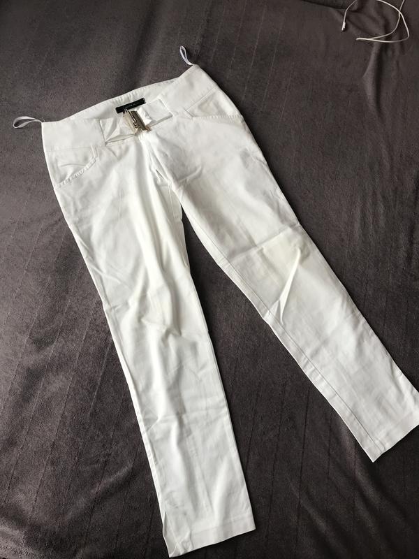Продам білі укорочені брюки з розпорками по боках на 6см,з гарною золотою пряшкою на поясі. Довжина 90 см, талія 38см,бедра 48см.