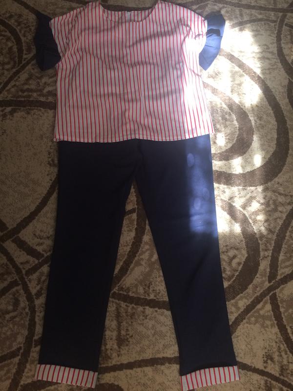 Брючний костюм, темно синього кольору,блузка та низ штанів білого кольору в червону полоску