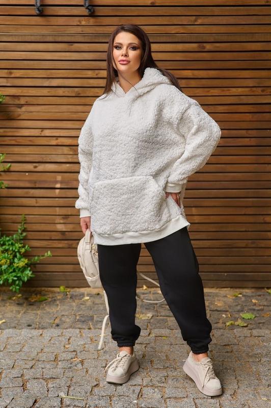 Худи Тедди Цена - 810 грн Материал: : мех барашка на тканевой основе. Низ и манжеты рукава на кашкорсе 2 р 42-54: ОГ 120, длина 75 см 3 р 56-62: ОГ 135, длина 81 см 4 р 64-72: ОГ 150, длина 81 см Размеры: 42-54, 56-62, 64-72 Штани на флісі цена 570 грн материал: тринит на флисе с пропиткой, благодаря которой ткань не кашлатится. Брюки средней посадки, пояс и низ брюк на резинке. Есть карманы. Длина 102/76. Замеры: 1 р (42-46):ОС 88-106 см, ОТ 65-90. 2 р (48-52): ОС 108- 120 см. ОТ 78-118 см , . 3 р (54-58): ОТ 86-135, ОБ 122-135 4р (60-64): ОТ 98-147, ОБ 130-148 Размеры: 42-46, 48-52, 54-58, 60-64 аш