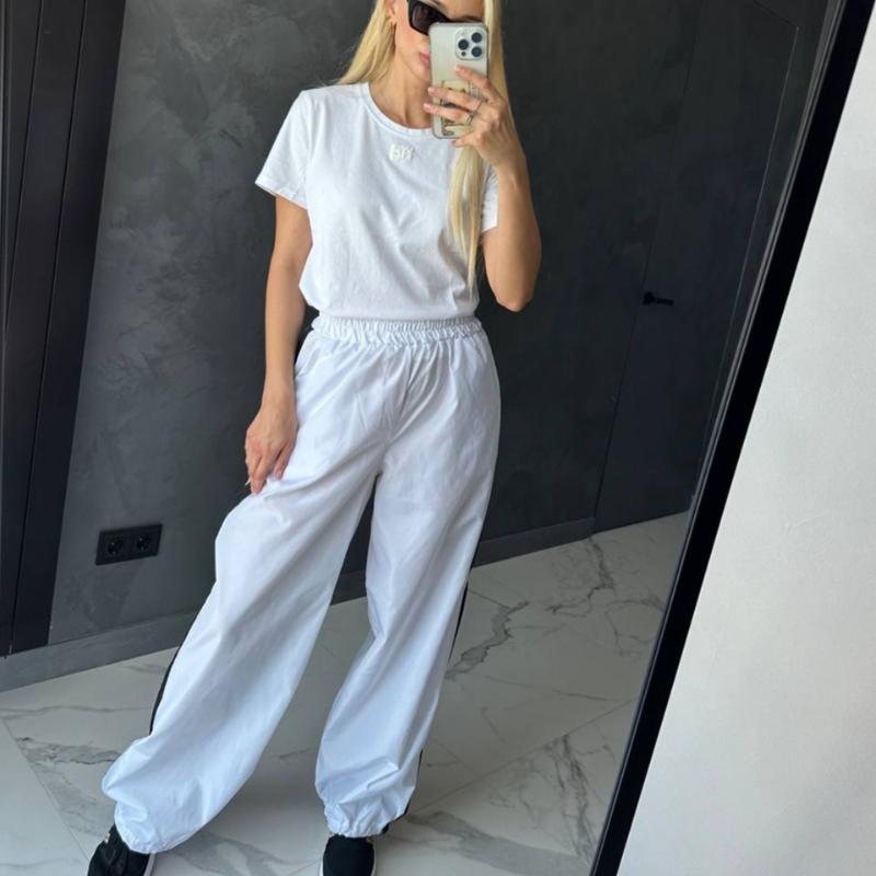 🔥ФОТО РЕАЛ🔥 Штани🔝 ▪Код товару: 732 ▪новая цена 490 грн 🔥 ▪Тканина: плащовка ▪Размеры: S-М; М-L ▪Цвета: белый+черный Параметри виробу на S-M: Длина шта: Внешний-105 Внутренний-76 ОТ-62-100 ОС-120 📌КРУТЕЗНЫЕ брюки на резинке 💣По бокам контрастные полоска. На поясе резинка, манжеты также на резинке, которая регулируется ♥️Широкие, прямые, идеальный пошив😎😊 код2005(ист)