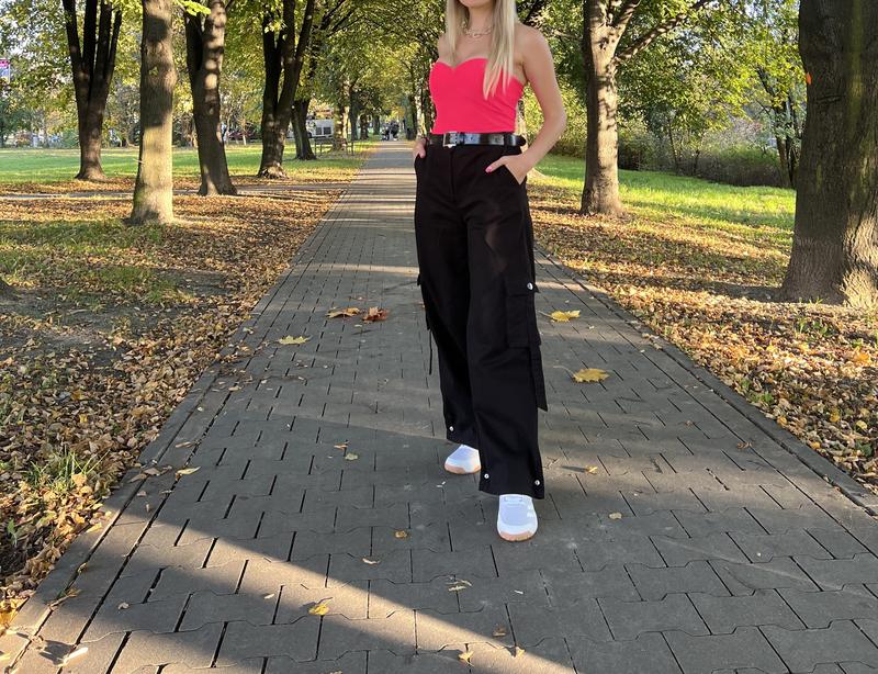Стильные, широкие брюки карго от бренда NA-KD Трендова модель не одного сезону По бокам карманы, есть карманы Высокая посадка Плотная ткань, отлично держат форму Стан - идеальный Замеры П. о. т-38 Высота посадки-28 П. о. б-50 Длина-106 Шаговой шов-74 Ширина низу-30