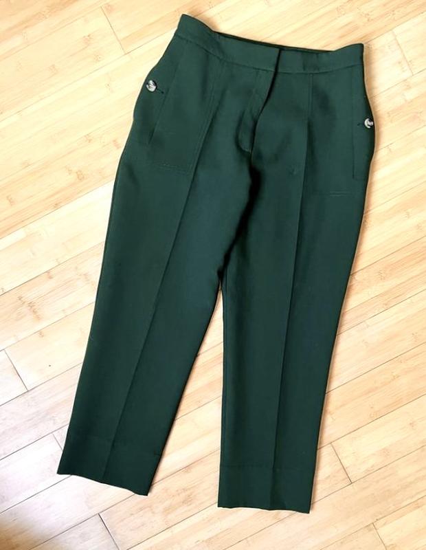 Стильные зеленые брюки зауженного кроя, с боковыми карманами на пуговицах,плотные, упругие, стрейчевые, красиво держат форму, более отменного качества и кроя.