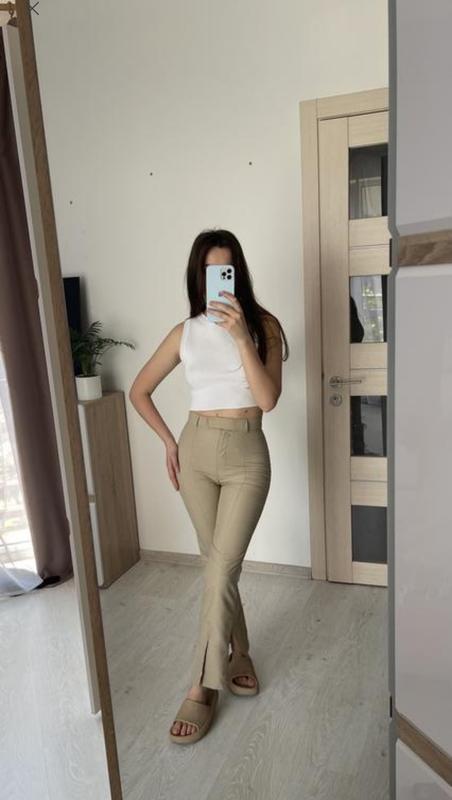 Брюки з легкої костюмної тканини, з актуальними розрізами. Колір фото не передає, в живу колір тепліший. Гарно моделюють фігуру. Нові, не носились. Розмір ХС. довжина 100 см, Пот 33,5 см, поб 46-47.