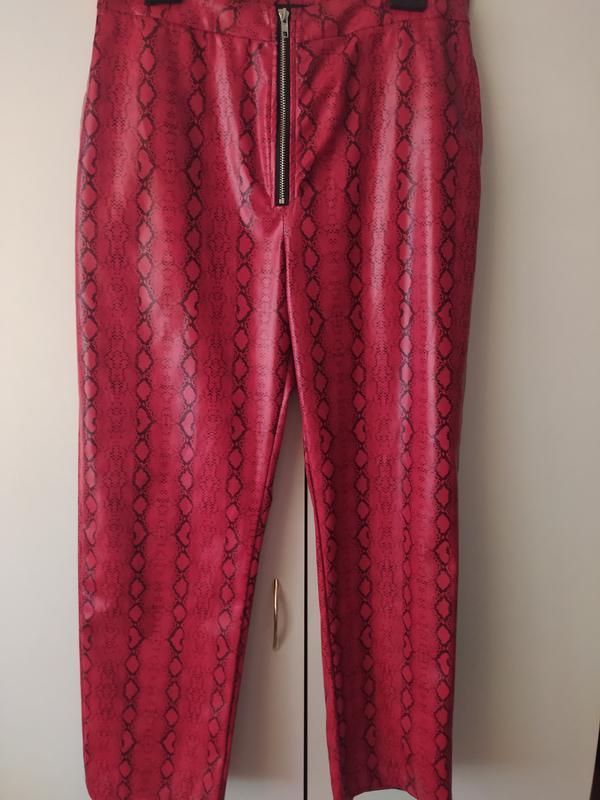 Шикарные брюки из кожзама. Новые, но нет бумажной этикетки. Сексуальным , стройным модницам, которые любят выглядеть не так как все, а лучше. Талия высокая , замок спереди. По боковым швам 2 глубоких кармана на черной шелковой подкладе. Ткань немного тянется, что всегда хорошо. Длина - 103 см, дл по внутренней стороне/ длина ноги/ 73 см, ПОТ- 43см, можно потянуть до 47см, может еще пару см можно натянуть.ПОБ - 57см.Потянуть- 65см.Цвет на фото красный , но это не так.В реале цвет темно- красный. Это брюки, не лосины. Обтягивать будут только там где нужно. ПОштанины в самом низу- 21 см. Размер указан европейский 40, это наш классический 48 размер.
