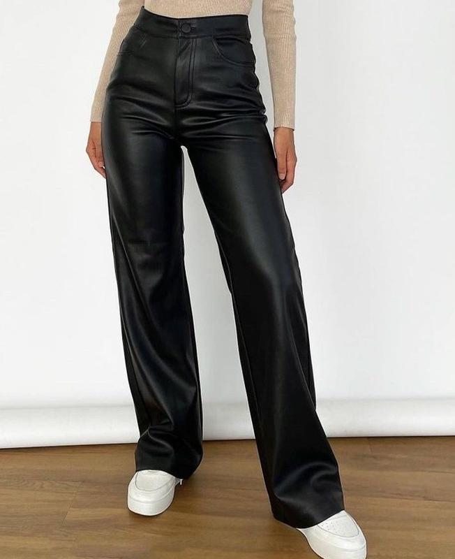 Брюки из эко кожи-это хит каждого осенне- зимнего сезона.Мастхэв! Брюки идут на высокой посадке, свободного кроя, что визуально делает ваши ножки еще длиннее и стройнее.