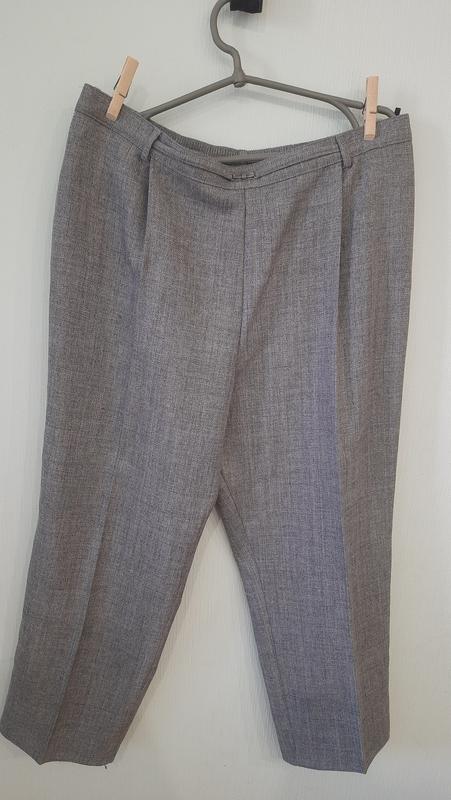 В идеальном состоянии брюки на девушку 56р. Длина с поясом до низа штанины 96см, длина шага 67см, длина с поясом до памперса 42см, беждра 65см, талия 46см, притаится к 56см, ширина низа штанины 23см.