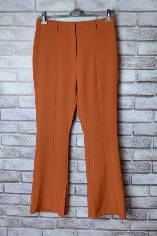 Мега стильные брюки клеш с разрезами от Boohoo на высокий рост. Внизу на штанине небольшое пятно, приносенные не заметная (последняя фото) Высокая посадка Стрейчевые Брючная ткань средней плотности. Размер 52 (UK 16) Пояс 45 см Стегна 60 см Посадка спереду 37.5 см Посадка сзади 48 см Длина по внешнему шву 121 см Длина по внутреннему шву 87 см Разрезы внутри брючин. Цвет кирпичный. Открытка Укр-почтой или Новой почтой Оплата на карту або Безпечна оплата від Шафи Безопасная оплата только Новой почтой