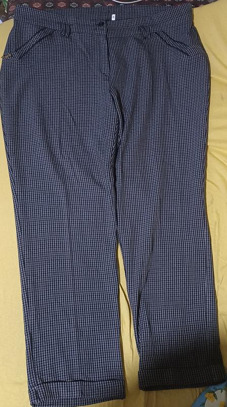 Брюки теплые в клетку. Сзади имитация карманов. Замеры: пот-52, пост- в спокойном состоянии 65, тянется до 69, длина по внешнему шву- 100 см, по внутреннему - 75, посадка- 29 см. Размер пишется 52