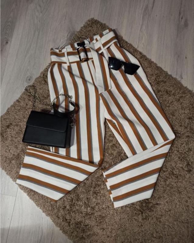 Пасок с круглой пряжкой в наличии Замеры: Талия - 33 см, Стегна - 46 см, Вся длина - 94 см, Длина по внутреннему шву - 67 см, Посадка спереду - 33 см, Посадка ззаду - 38 см, Ширина штанины вверху - 30 см, а внизу - 17 см. Ширина ремешка - 6,5 см. Молния - 17 см. ❤️❤️❤️ Брюки очень хорошо тянутся, удобны. Новые) Без дефектов)