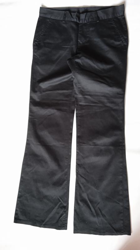 черные,гарная ткань, охороший состав ткани, длина107см,пояс полуобхват42-43,бедра53 тянется60,ширина штанины внизу26,шаг84, посадка спереди27, посадка сзади40см,потертостей в пахе нет (на фото),застежки металлические на поясе