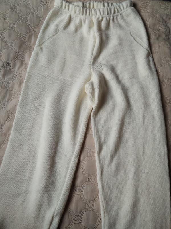 трикотаж, новые, цвет молоко, к ним можно взять голубой свитер, они похожи. Замеры- пояс пон до 39-40, бедра 48 в ск стане, длиж 105, посадка 37.