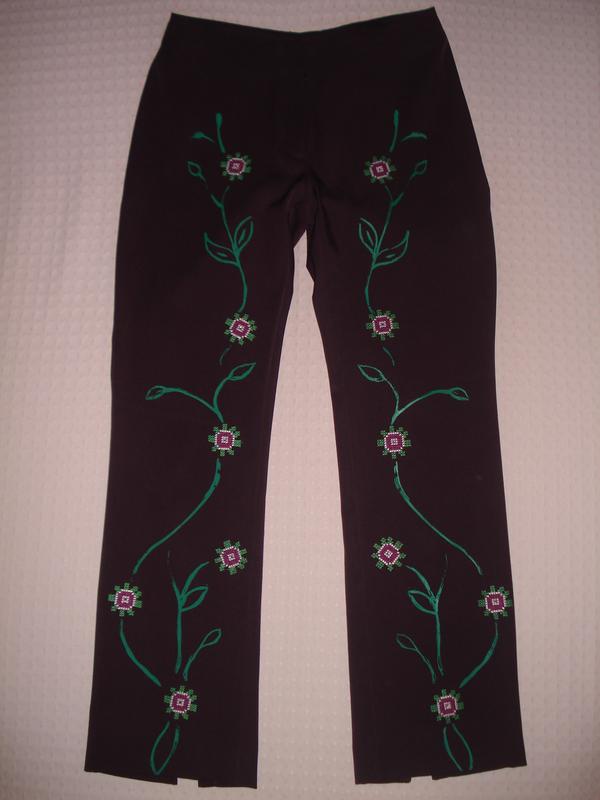 Брюки RIUNITO Размер - 44 Производство - Италия. Цвет - баклажановый. Состав: 97% полиэстер, 3% лайкра. На попе 2 кармана. Сзади на штанининах - разрез (фото №3). Цветы вышиты, посредине каждого цветочка - камушек (фото №4) Состояние отличное, но есть маленький нюанс. ЗАМЕРЫ: ПОТ - 38 см. ПОБ - 48 см. Длина по внутреннему шву - 74 см. Длина по внешнему шву - 98 см.