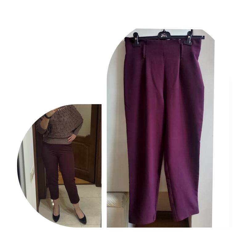 штаны 7/8 цвета марсала. без замков и застежек. сзади на резинке. спереди защипы. ткань эластичная. завышенная талия. есть шлевки для пояса. очень красивый цвет. размер С/М.