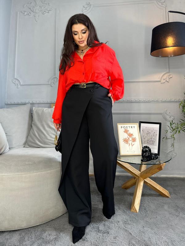 💙💛В НАЯВНОСТИ 💙💛Ультрамодные брюки на запах. Модель 3286. Размеры: 42-44, 46-48, 50-52 🔥Цена: 540 грн. 🔥 Тканина: костюмка Цвет: черный, серый Прямые брюки с эффектным асимметричным запахом спереди из костюмной ткани. Сочетаются с рубашками, футболками, свитшотами и худи. Брюки средней посадки, с боковыми карманами. Застежка брюк на молнию и пуговицу, пояс сзади на широкой резинке, для идеальной посадки. 🇺🇦🇺🇦🇺🇦🇺🇦🇺🇦🇺🇦🇺🇦🇺🇦🇺🇦🇺🇦🇺🇦🇺🇦