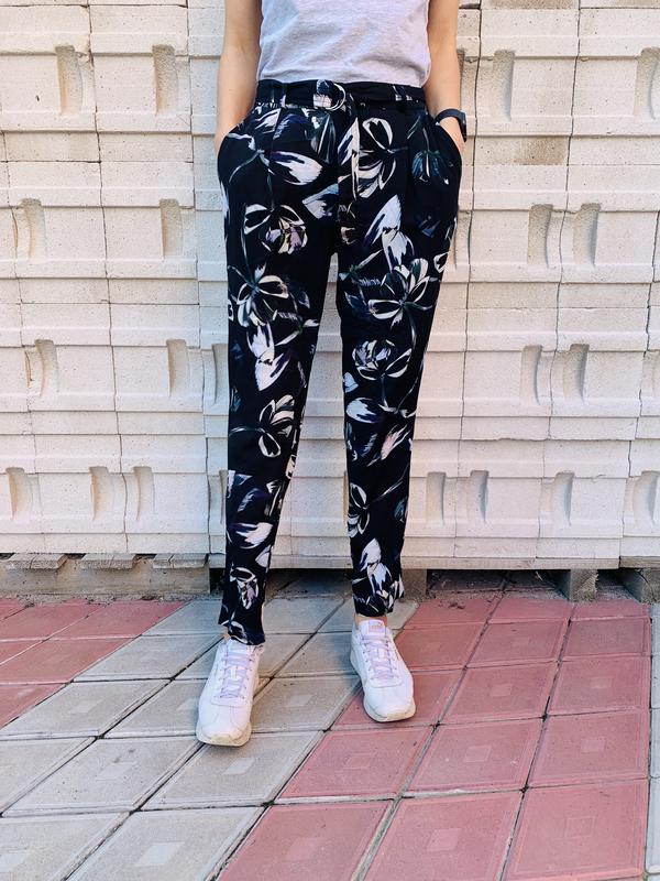 Штани тоненькі, спереду ремінець, ззаду резинка, з кишенями, середня посадка. Річ нова, з біркою. Зріст моделі 170