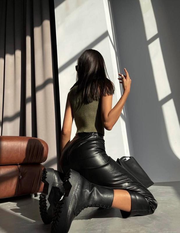Арт 844-344 кожаные штаны ◾️ткань: матовая эко кожа ◾️цвета: черный ◾️SM, ML Цена 820 грн Классические брюки прямого кроя из эко кожи 🔥 Очень стильная и универсальная вещь в гардеробе ; Сочетаются абсолютно со всем 👌 Брюки выполнены из матовой эко кожи, высокого качества. высокая посадка; Размеры SM <unk> ML Талия: 60-68 см <unk> 69-75 Стегна: 88-95 см | 96-100см
