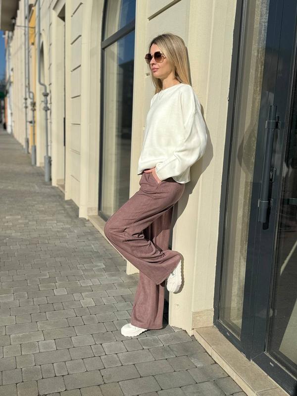 Штани Мод.035_ Тканина: замш рубчик Розмір: S, M, L, XL Колір: чорний та мокко Штани палаццо вільного крою, на резинці, з карманами та завищеною талією Ціна: 680 грн
