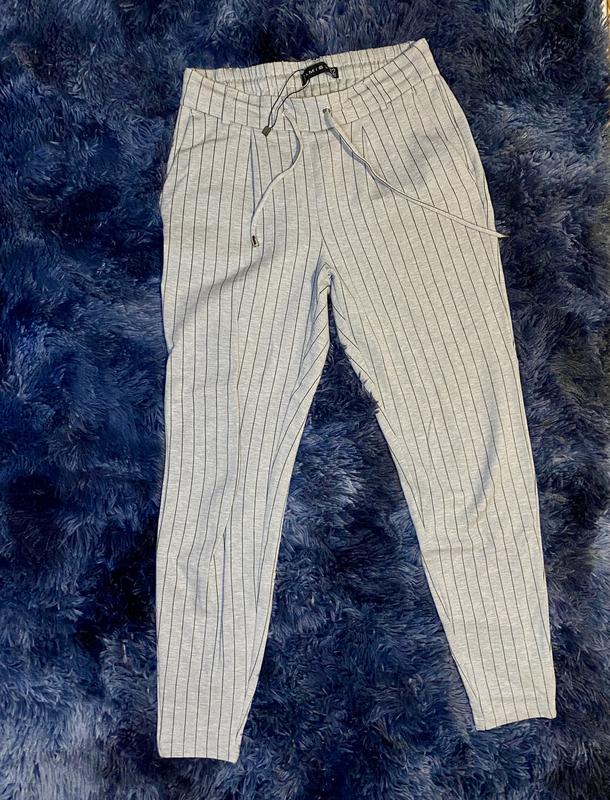 Нові брюки, сірого кольору в полосу, з щільної тканини.