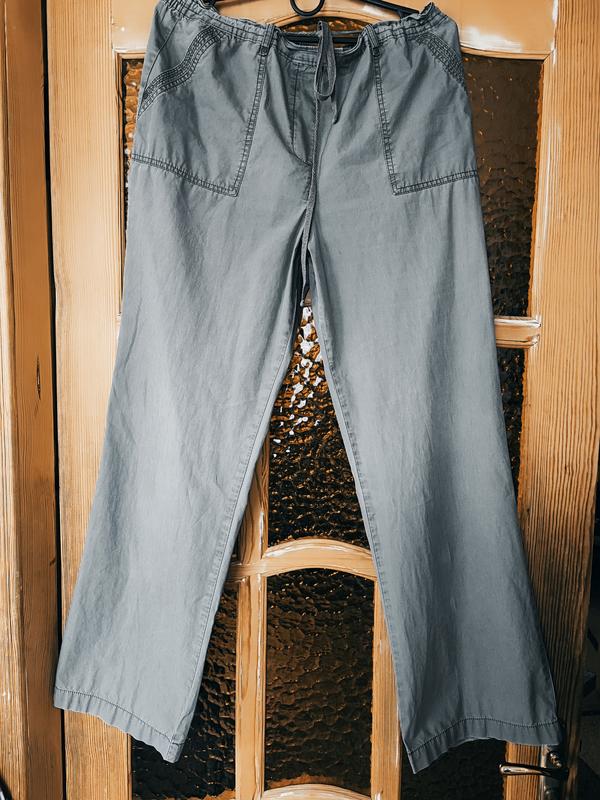Стильные брендовые брюки палаццо из лёгкого коттона на резинке и шнурке. Спереди и сзади по два кармана для рук и мелочей. Высокая комфортная посадка. Высота посадки 30 см. По внешнему шву 108 см., внутренний шов 78 см. Свободные и невероятно удобные. Такой простой и универсальный предмет гардероба можно сочетать со многими вещами. Состояние идеальное.