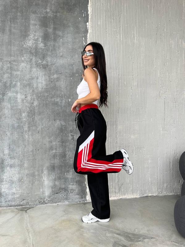 Брюки, фото реал ⠀ ▫️розміри: 42-44, 46-48 ▫️тканина: джинс + трикотаж ▫️кольори: чорний +червоний, чорний+ трава, синій + бірюзовий, синій +лео ⠀ Актуальні комбіновані джинсові брюки з лампасами мають по бокам трикотажні вставки, дві зручні кишені, низ на кулісці. ⠀ Заміри по виробу: ОС 105 см | 111 см Довжина 107 Пояс на резинці + шнурівка ⠀ Модель 183