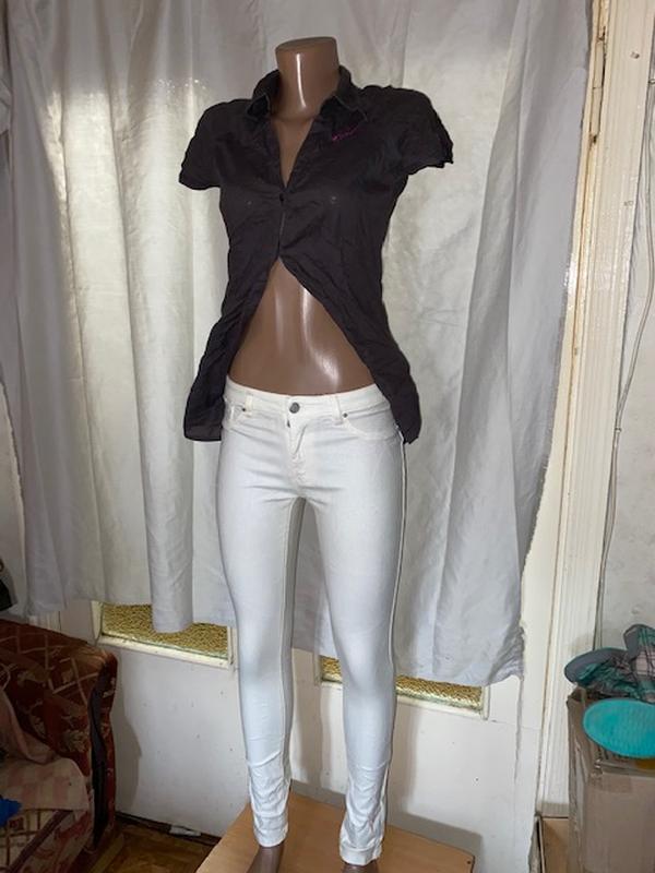 Качественные, стрейчевые брюки, нежного белого цвета с золотистым отливом. Есть недостатки. Также, на фото к ним есть на выбор 2 кофточки.